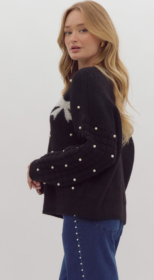 Black Round Neck Knit Sweater with Pearl and White Bow Details