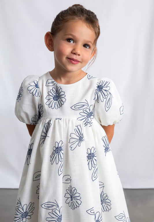 Girl Puff Sleeve Dress-Navy Embroidered Flowers