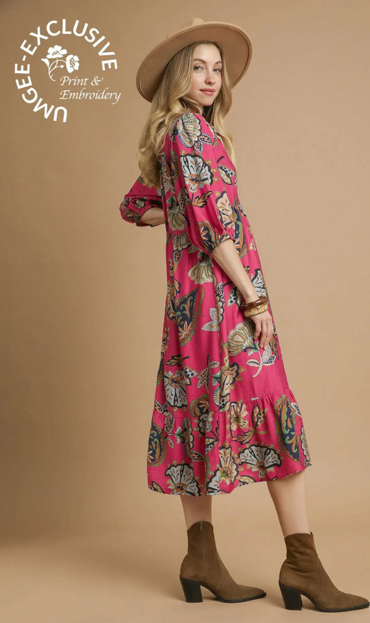 Magenta Paisley Print Midi Dress