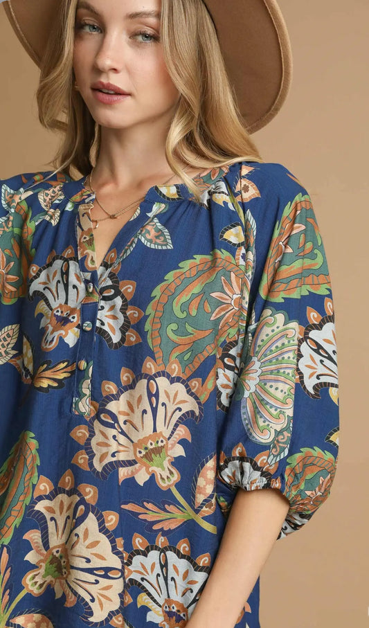 Navy- Boho Paisley Puff Sleeve Blouse