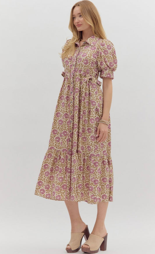 Purple Floral Midi Dress w/ Front Button Closure
