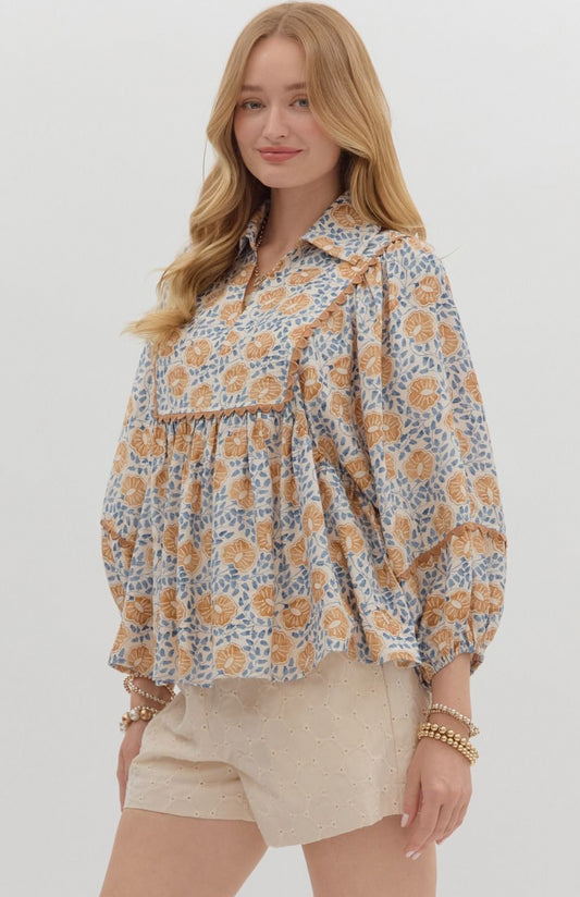 Camel Floral Print Top w/ Long Lantern Sleeve